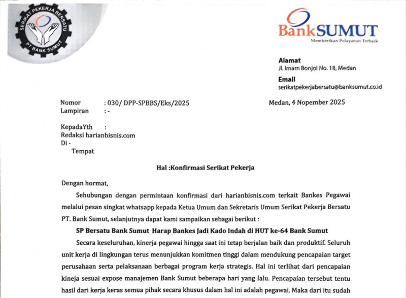 Berikut keterangan resmi dari SP Bersatu PT Bank Sumut:
