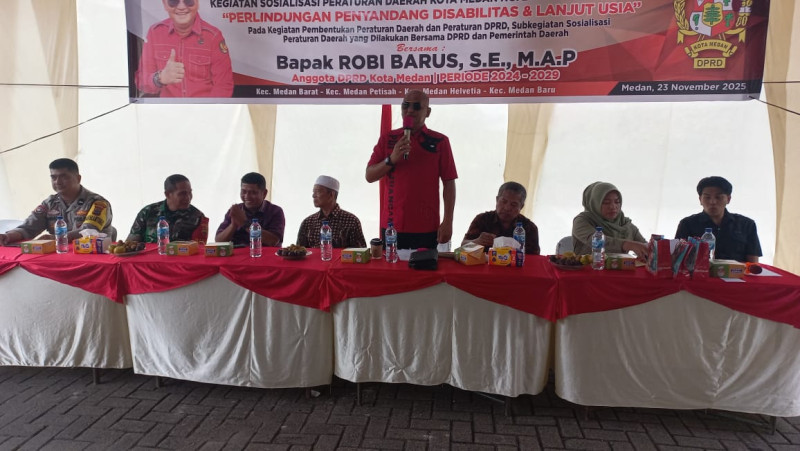 Hal itu ditegaskan Ketua Fraksi PDI Perjuangan DPRD Kota Medan, Robi Barus SE M.AP saat menggelar Sosialisasi Peraturan Daerah (Perda) Nomor 2 Tahun 2024 tentang Perlindungan Penyandang Disabilitas dan Lanjut Asia (Lansia) di Jalan Pelita Kelurahan Pulo Brayan Kota, Kecamatan Medan Barat, Minggu (23/11).